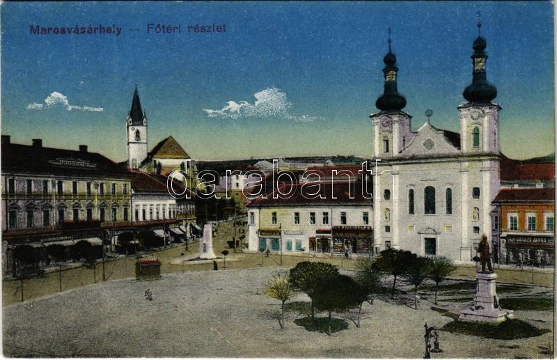 Marosvásárhely, Targu Mures; Fő tér, Takarékpénztár, Fritsch Jenő, Lukács János üzlete. Porjes S. Sándor kiadása / main square, savings bank, shops