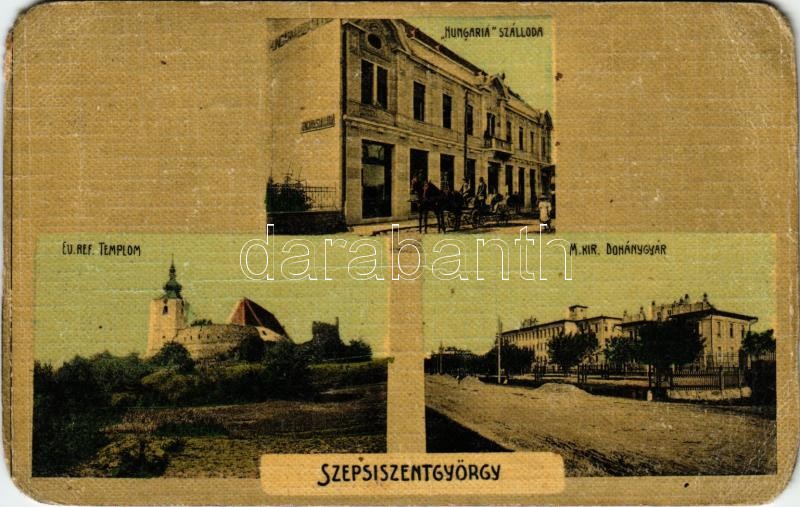 Description: Sepsiszentgyörgy, Sfantu Gheorghe; Hungária szálloda, Református templom, M. kir. dohánygyár. Benkő Mór kiadása / hotel, Calvinist church, tobacco factory (EK)