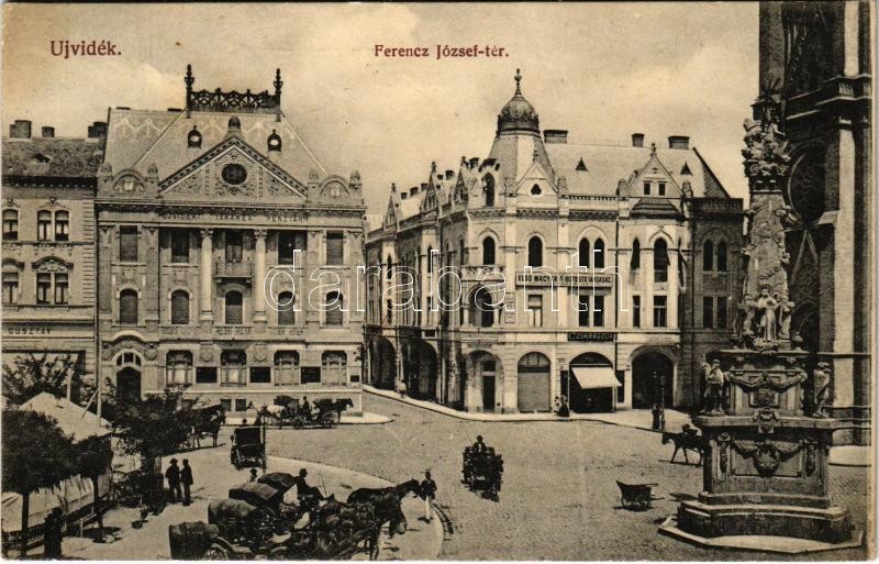 1913 Újvidék, Novi Sad; Ferenc József tér, Első Magyar Biztosító Társaság, cukrászda, takarékpénztár, piac / square, insurance company, confectionery, savings bank, market