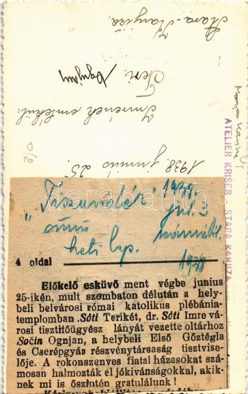 Description: 1938 Magyarkanizsa, Ókanizsa, Stara Kanjiza; Sóti Terika és Socin Ognjan az esküvő után + ragasztott újságcikk és aláírások a hátoldalon / married couple after the wedding. Glued newspaper article and signatures on the backside, Atelier Kriser photo