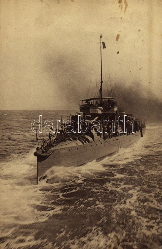 1908 WAL osztrák-magyar torpedóromboló (később Tb 54 T). A levél írója Szelke Árpád újonc tengerész akadémikus kadét, később U-16 fregatthadnagya. 1916. október 17-én a süllyedő U-16 tengeralattjáró kapitánya őt utasította a titkos iratok és a hajókönyv megsemmisítésére / S.M. Hochseetorpedoboot Wal. K.u.K. Kriegsmarine. Phot. A. Beer / Wal, Austro-Hungarian Navy Deep-sea torpedo boat (later TB54T). The letter writer is the Austro-Hungarian Navy freshman cadet (Árpád Szelke), later the Lieutenant commander of U-16 submarine. WWI 1916 October 17, the Captain of the sinking U-16 submarine instructed him to destroy the secret documents and the ship's book (EK)