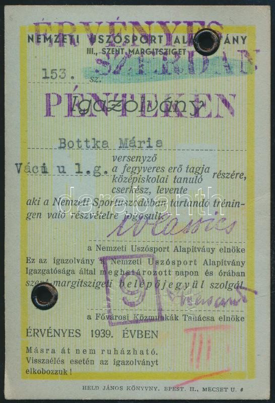 1939 Fényképes igazolvány, Nemzeti Úszósport Alapítvány, Szent Margits...