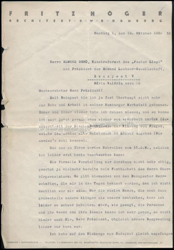 1930. okt. 19 Fritz Höger (1877-1949, teljes nevén Johann Friedrich Höger), német építész, a Backsteinexpresszionizmus jelentős képviselőjének német nyelvű levele Gerő Ödön (1863-1939) műkritikusnak, a Pester Lloyd újságírójához, a Lechner Ödön Társaság elnökéhez, amelyben a magyarországi utazásáról ír, valamint részletesen kifejti gondolatatait Lechner Ödön munkásságáról. Úgy érzi, hogy belső kapocs köti össze a magyar szecesszió mesterével: "Ich für meine Person freue mich, innere Beziehungen zu versprüren zu diesem Ihrem Meister, dessen Schaffen nun so weit hinter uns liegt (....)". A levelét két verses idézettel zárja. 4 géppel írt oldal, Höger fejléces levélpapírján és autográf aláírásával. / Letter from Fritz Höger (1877-1949, full name Johann Friedrich Höger), german architect, known for his Brick Expressionist (Backsteinexpressionismus) style of architecture, to Edmund (Ödön) Gerő (1863-1939), journalist of Pester Lloyd and president of the Ödön Lechner Society, in which he praises Lechner, who was the most important architect of the Hungarian Art Nouveau. 4 pages, with autograph signature of Höger.