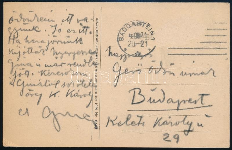 1931 Kernstok Károly (1873-1940) festőművész autográf, saját kézzel aláírt képeslapja Bad Gasteinból Gerő Ödön (1863-1939) újságíró, a Pester Lloyd műkritikusának küldve, "Ödönkém" megszólítással, amelyben Nyergesújfaluba invitálja a Gerő családot: "Ha hazajövünk kijöttök Nyergesre". Kernstok Nyergesujfalusi birtoka a modern magyar művészet egyik központjává vált a XX: sz. elején, a Nyolcak művészcsoport bölcsője volt, majd a Tanácsköztársaság ideje alatt szabadiskolát vezetett ott Kernstok. Lap alján Kernstok Károlyné Stricker Gina aláírásával is. Sarkaiban apró sérülésekkel.