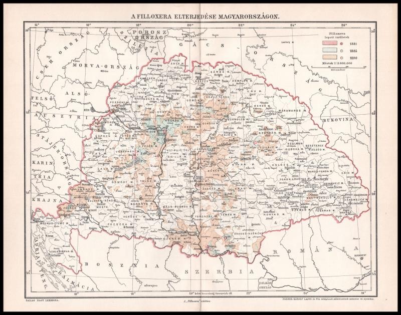Description: cca 1890 A filloxera elterjedése Magyarországon 1:3.600,000, Posner Károly Lajos és Fia térképészeti műintézetének metszése és nyomása, Pallas Nagy Lexikona, 23,5×30 cm