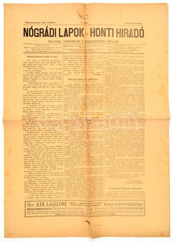Description: 1894. február 4., Nógrádi Lapok és Honti Híradó, politikai, társadalmi s közgazdászati hetilap, XXII. évfolyamának 6. száma, többek közt írással Balassagyarmatról, sérült