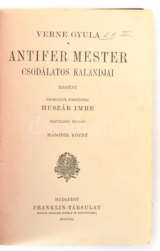 Verne Gyula: Antifer mester csodálatos kalandjai. I-II. köt. Ford.: Hu... https://www.darabanth.com/en/375-Online-auction/375.0/Books/Books-Other-rarities~1000017/Verne-Gyula-Antifer-mester-csodalatos-kalandjai-I-II-kot-Ford-Huszar-Imre-Harmadik-kiadas~II2199634