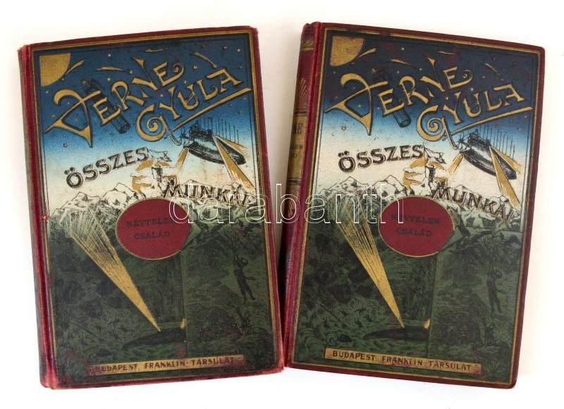 Verne Gyula: Névtelen család. I-II. köt. Ford.: Huszár Imre. Bp.,é.n.,Franklin, 248;199+1 p. Számos képpel gazdagon illusztrálva. Kiadói illusztrált, aranyozott, festett egészvászon-kötésben, a borÃtón kis kopásnyomokkal, hiányzó elülsÅ‘ szennylappal az I. kötetben, a II. kötet gerincén kis sérüléssel.