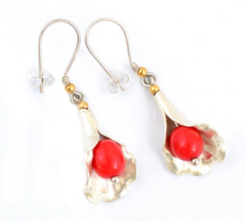 Ezüst(Ag) korallos lógós fülbevalópár, jelzett, 4,5x1,5 cm, bruttó: 5,...