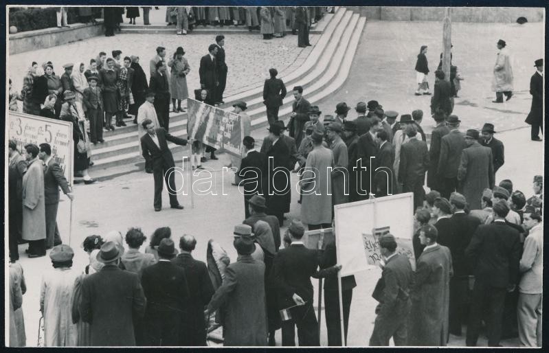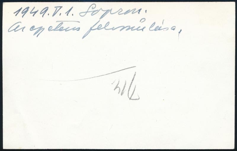 1949 május 1., Sopron, az egyetem felvonulása, csoportfelvétel a tömegről, propaganda transzparensekkel ("szabadságért és békéért harcoló (...), 3 éves terv, 5 éves terv"), hátoldalán feliratozott vintage fotó, 9x14,5 cm