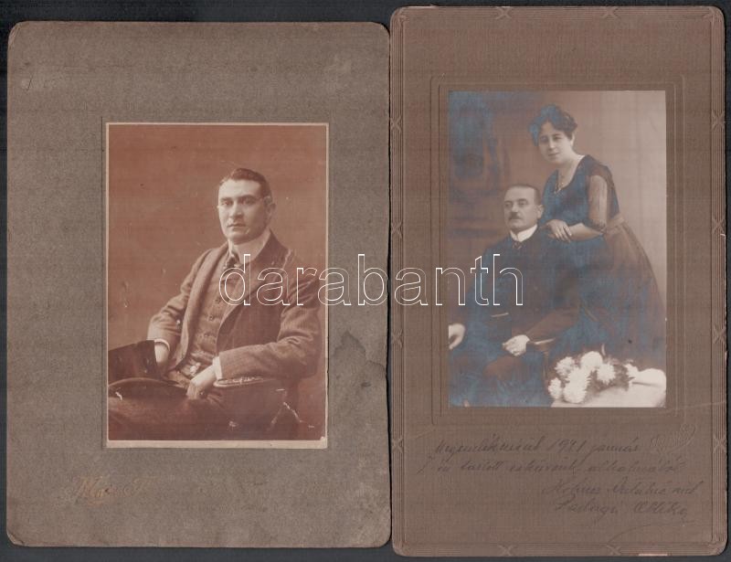 cca 1890-1921 össz. 9 db keményhátú fotó és fotólap különböző műtermekből (Gömör, Szatmár; Oroszy, Nagybecskerek; Szenetra, Temesvár stb.), többsége portré, egy vadakat ábrázol. Egyik fotó Guttmann Miklós (1876-1944) zenekritikus, zeneszerző, zongoraművész portréja, Mai és Tsa műterméből, hátoldalán dedikált. Részben hátoldalán feliratozott, részben sérült, foltos, kopott, 8,4×13,3 és 24,5x18 cm közötti méretekben