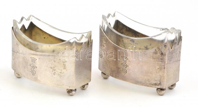Üveg só/borstartó, ezüst foglalatban, 2 db, jelzett, csorbával, 4x5,5 cm