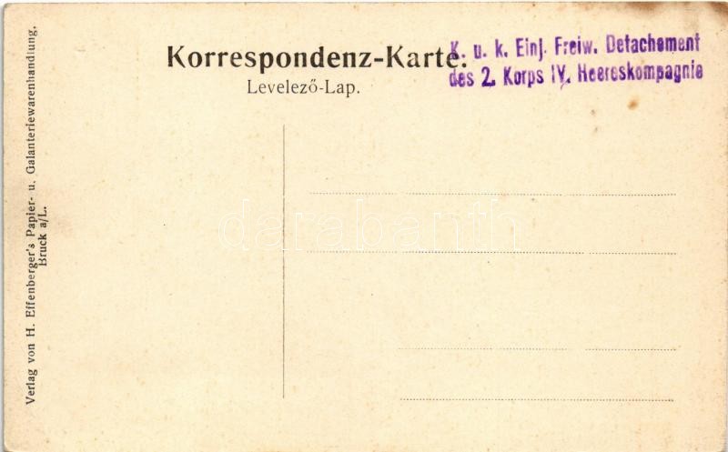 Lajtabruck, Bruck an der Leitha; Lagerstrasse und Fischer's Bräuhaus / Laktanya utca, sörgyár / street, brewery + "K.u.K. Einj. Freiw. Detachement des 2. Korps IV. Heereskompagnie"