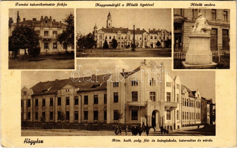 Description: 1942 Hőgyész, Tamási takarékpénztár fiókja, Nagyvendéglő a Hősök ligetével, étterem, Hősök szobra, emlékmű, Római katolikus polgári fiú és leányiskola, internátus és zárda. Engel Ferenc kiadása. Neuvelt foto (EK)