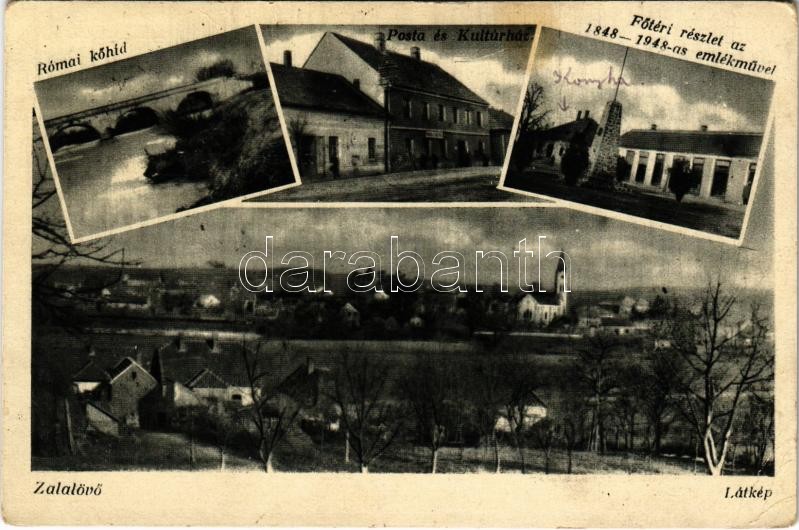 Zalalövő, Római kőhíd, Posta és Kultúrház, Fő téri részlet az 1848-1948-as emlékművel, látkép. Pintér és Németh kiadása (fl)