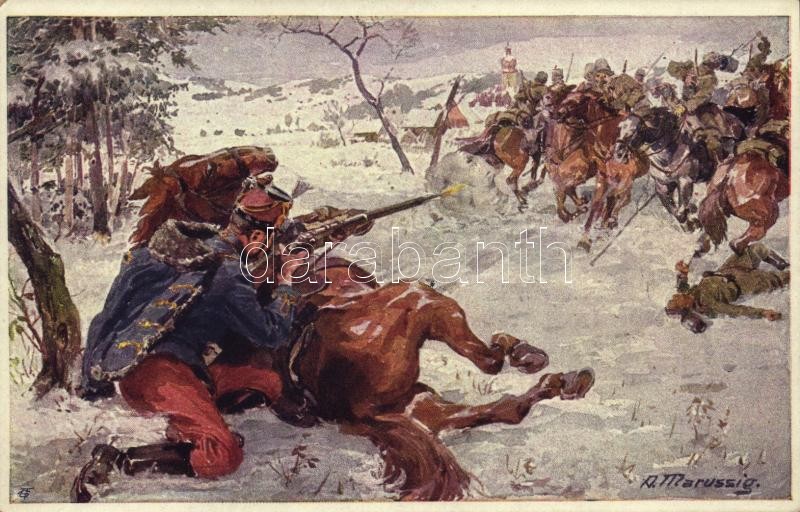 Description: Husar Samuel Kralik, vom Husarenregiment Nr. 6. Aus dem goldenen Buche der Armee Serie I. Offizielle Karte für Rotes Kreuz, Kriegsfürsorgeamt, Kriegshilfsbüro Nr. 197. / WWI Austro-Hungarian K.u.K. military art postcard s: A. Marussig