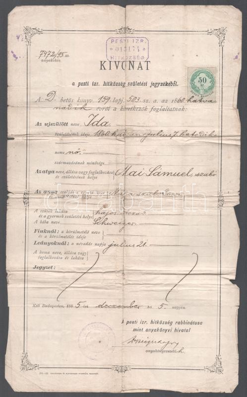 https://www.darabanth.com/en/376-Online-auction/376.0/Art-and-other-collectibles/Judaica~500024/1895-Bp-Kivonat-a-pesti-izraelita-hitkozseg-szuletesi-jegyzekebol~II2208696