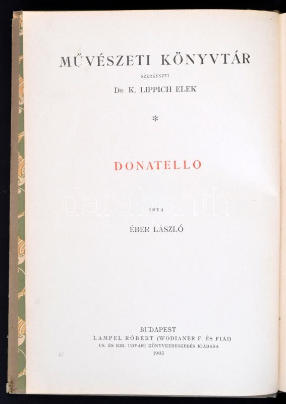 Éber László: Donatello. Művészeti könyvtár. Bp.,1903, Lampel R. (Wodia... https://www.darabanth.com/en/376-Online-auction/376.0/Books/Books-Architecture-Art~1000006/Eber-Laszlo-Donatello-Muveszeti-konyvtar-Bp-1903-Lampel-R-Wodianer-F-es-Fiai-Szov~II2066626