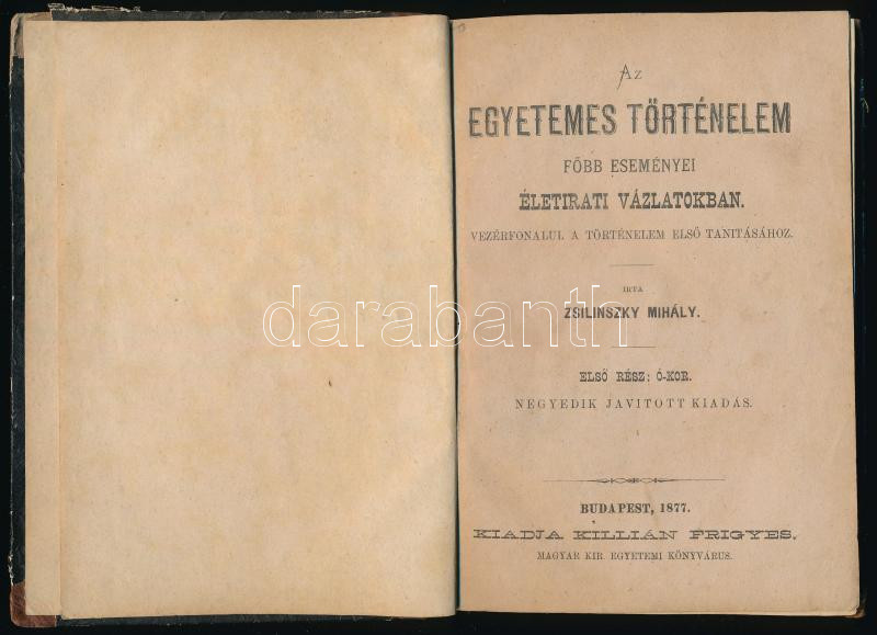Zsilinszky Mihály: Az egyetemes történelem főbb eseményei életirati vázlatokban. Vezérfonalul a történelem első tanításához. Első rész: Ó-kor. Bp., 1877, Killián Frigyes, 140+4 p. Negyedik, javított kiadás. Korabeli félbőr-kötés, megviselt állapotban, a borítója és a gerince kopott, sérült, az előzéklapon ceruzás jegyzettel, a kötése megtört, sérült.