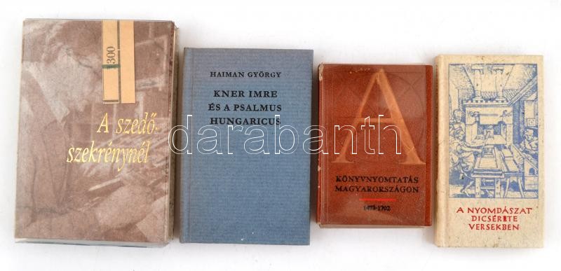 4 db nyomdászattal kapcsolatos minikönyv - A nyomdászat dicsérete versekben; A szedőszekrénynél; Kner Imre és a Psalmus Hungaricus; Könyvnyomtatás Magyarországon 1473-1702. Kötetenként változó kötésben és állapotban, közte 3 db sorszámozott.
