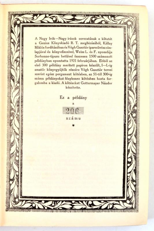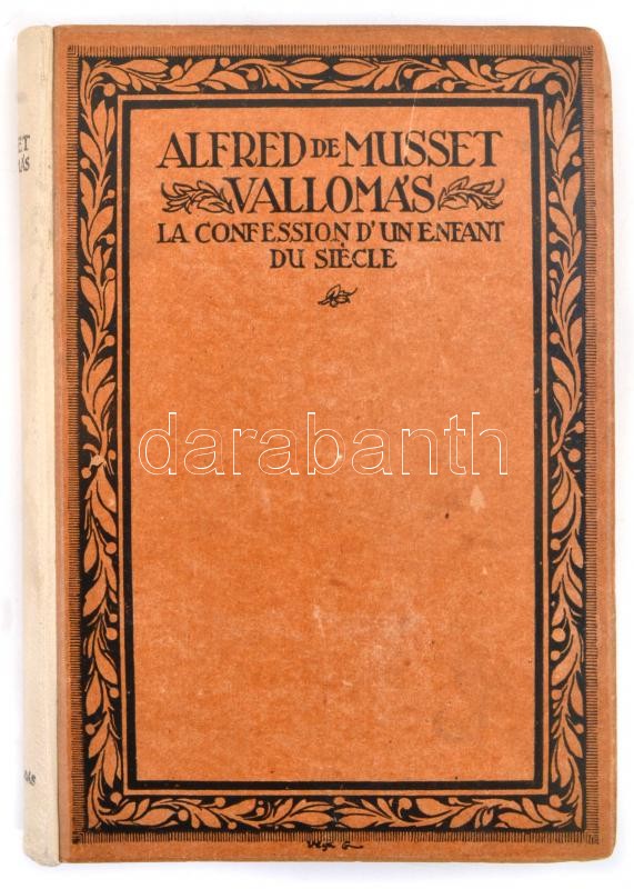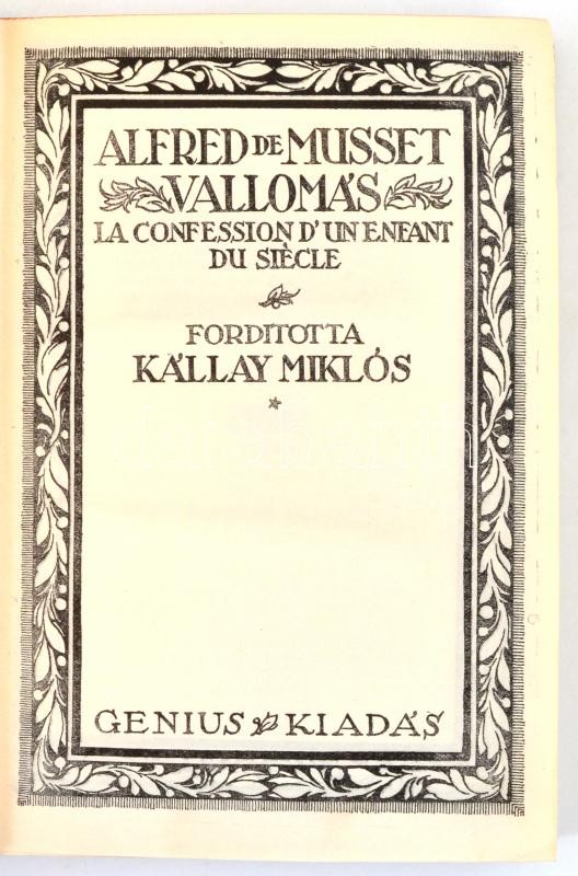 Alfred de Musset: Vallomás. Ford.: Kállay Miklós. Nagy Írók-Nagy Írások. Első sorozat. V. Bp.,(1921.), Genius, (Weiss L. és F.-ny.), XVI+342+2 p. A címlap és a könyvdíszek Végh Gusztáv grafikus, iparművész munkái. A kötésterv Gottermayer Nándor terve. Kiadói fénylemez-kötésben, jó állapotban. Megjelent 1500 számozott példányban. Ebből az első 300 példány merített papíron készült. Számozott (300/206.) példány.