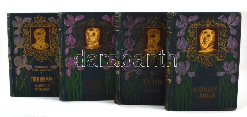 Remekírók képes könyvtára 4 db: Tóth Kálmán válogatott költeményei, Tóth Ede munkái, Kisfaludy Sándor összes költeményei I-II. Szerk.: Radó Antal. Bp.,1901-1902, Lampel R. (Wodianer F. és Fiai.) Kiadói aranyozott egészvászon-kötés, kopottas állapotban, kissé sérült gerinccel, tulajdonosi névbejegyzéssel, mintás lapélekkel.