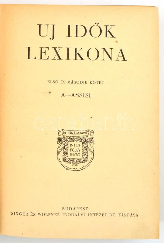 Új idők lexikona 1.-24., 12 két kötetben. Bp., 1936-1942, Signer és Wolfner Irodalmi Intézet Rt. Számos egészoldalas és szövegközti illusztrációval. Egységes kiadói aranyozott egészvászon sorozatkötésben, változó állapotban, közte kopott borítókkal, egy kötet laza fűzéssel, egy kijáró, kissé sérült, kissé hiányos lappal.