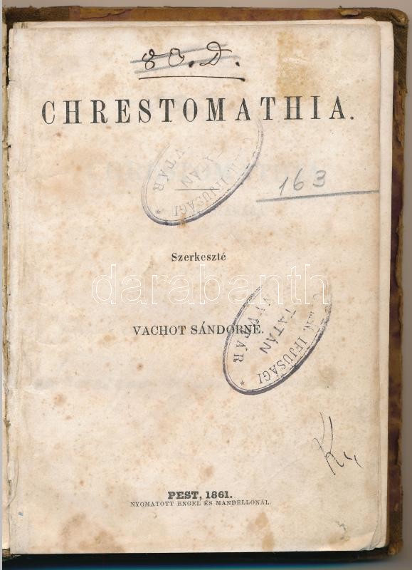 Chrestomathia az ifjúság számára. Szerk.: Vachot Sándorné. Pest, 1861,... https://www.darabanth.com/en/376-Online-auction/376.0/Books/Books-Tales~1000017/Chrestomathia-az-ifjusag-szamara-Szerk-Vachot-Sandorne-Pest-1861-Engel-es-Mandello-1-t~II2212455