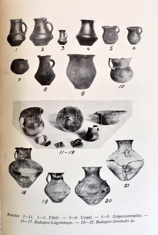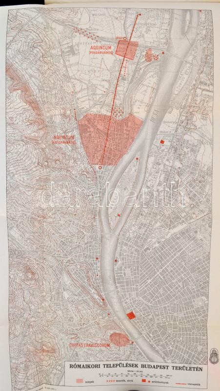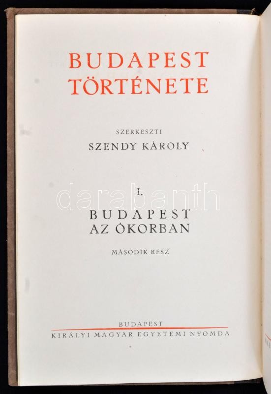 Budapest története. I-II. köt.: Budapest az ókorban. I-II. rész. Szerk.: Szendy Károly. Bp.,1942, Kir. M. Egyetemi Nyomda, XXIII+352 p.+LIV (fekete-fehér képtáblák)+1 (kihajtható ábra) t. +2 (kihajtható térkép)+1 (nagyméretű térkép-melléklet:Az őskori kultúrák Budapest területén, 73x61 cm) t.; 353-867 p.+LV-CXLVII (fekete-fehér képtáblák)+1 (kihajtható ábra) t.+4 (kihajtható térkép) t. Kiadói kissé kopott félbőr-kötésben, ex libris bélyegzésekkel.