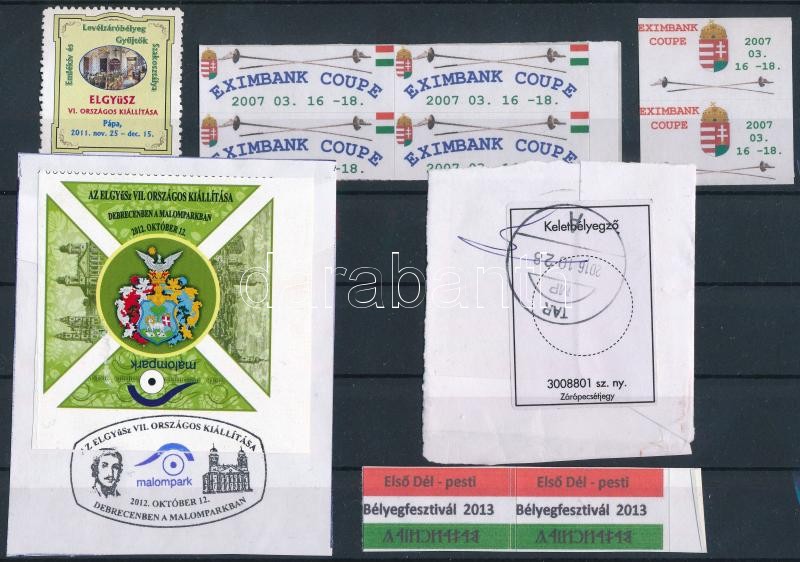 11 db levélzáró; részletezve: a 2011-2012 ELGYÜSZ VI. és VII. Országos KiállÃtás levélzárói (2db) az egyik felragasztva emlék alkalmi bélyegzÅ‘ lenyomattal + 2013-ból (2db) az elsÅ‘ Dél-Pesti fesztivál + 2007-bÅ‘l (6db) az EXIMBANK COUPE lévélzárói + 1 db a Magyar Posta zárópecsétjegye a 2016 sérülten érkezett levélrÅ‘l
