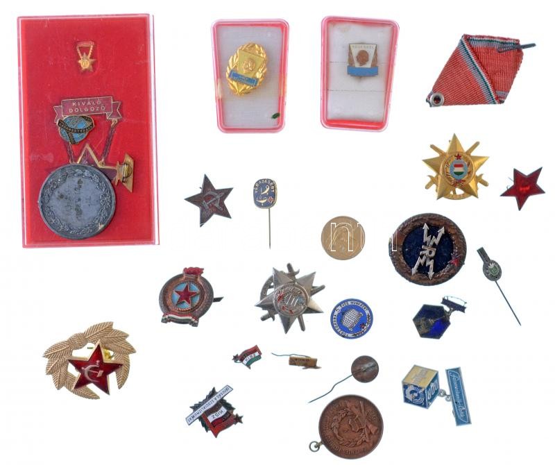 25 db-os vegyes jelvény, kitüntetés és kitűző tétel, közte "Kiváló Dolgozó" zománcozott fém kitüntetés miniatűrrel, eredeti tokban T:vegyes