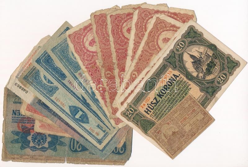 1913.20K "DEUTSCHÖSTERREICH" felülbélyegzéssel + 1915. 10K "DEUTSCHÖSTERREICH" felülbélyegzéssel + 1916. 1K + 1917. 2K + 1920. 1K (3x) + 2K "aa" (3x) + 2K "ab" (3x) + 20K + 100K + 1919. Pécs 20f T:III-IV