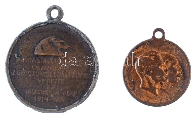 Description: Osztrák-Magyar Monarchia 1914. "Ferenc József - II. Vilmos / 1914 Viribus Unitis" Br medál füllel (16mm) + Murányi Gyula (1881-1920) 1915. "A Krasniki diadalmas csatában az oroszoktól elvett ágyúból verette az Auguszta-Alap" Br emlékérem fém keretben (22mm) T:2,2-