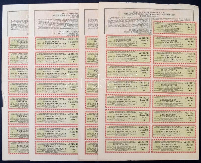 Description: Ausztria / Bécs 1917. "6. Osztrák Hadikölcsön" 5 1/2%-os államkincstárjegye 10.000K-ról szelvényekkel (4x), ebből 3x sorszámkövetők T:III kis szakadások Austria / Vienna 1917. "6th Austrian War Loan" 5 1/2% state treasury certificate about 10.000 Kronen with coupons (4x), with 3x sequential serials C:F small tears