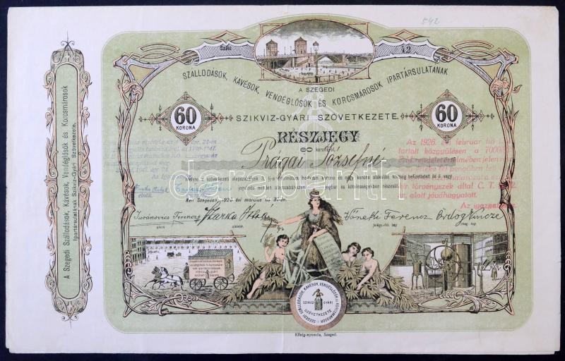 Szeged 1920. "Szegedi Szállodások, Kávésok, Vendéglősök és Korcsmárosok Ipartársulatának Szikviz-Gyári Szövetkezete" részjegy 60K-ról szelvényekkel, szárazpecséttel, bélyegzésekkel T:II-,III