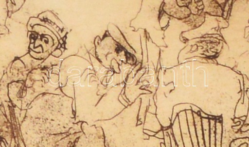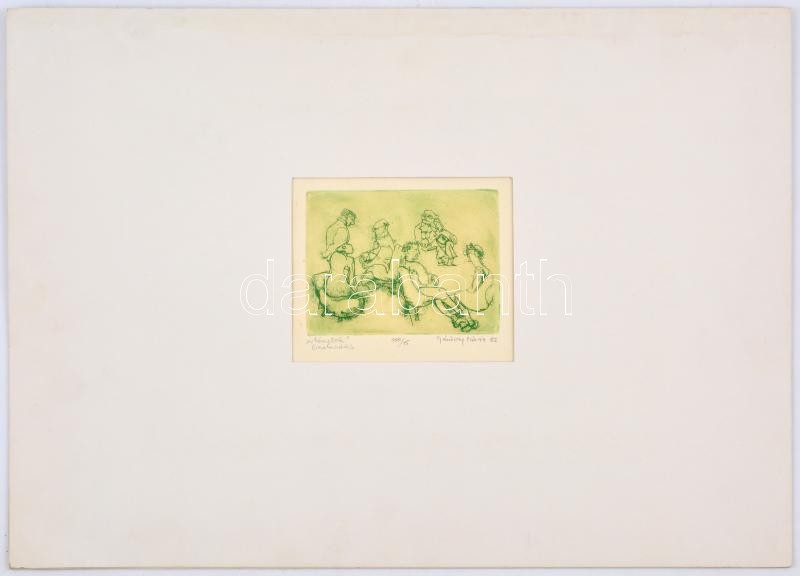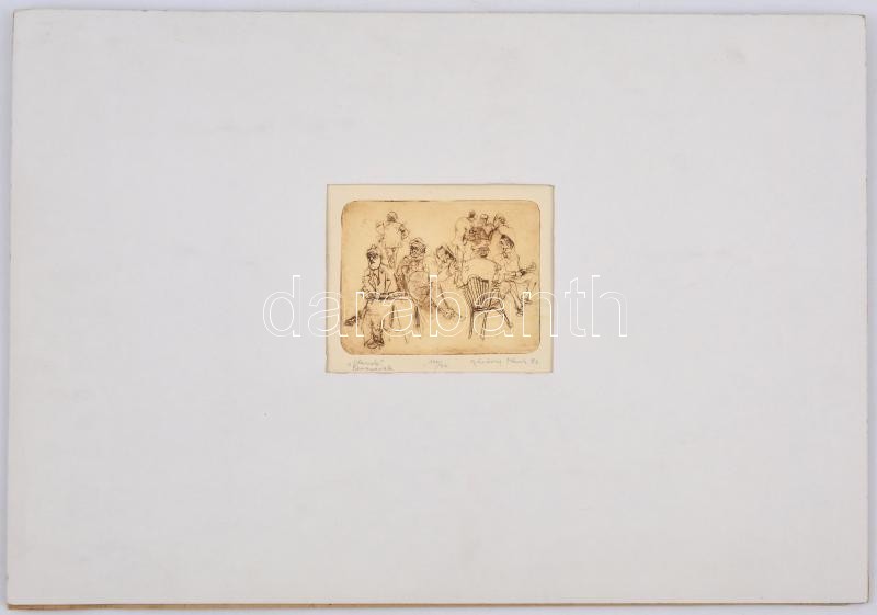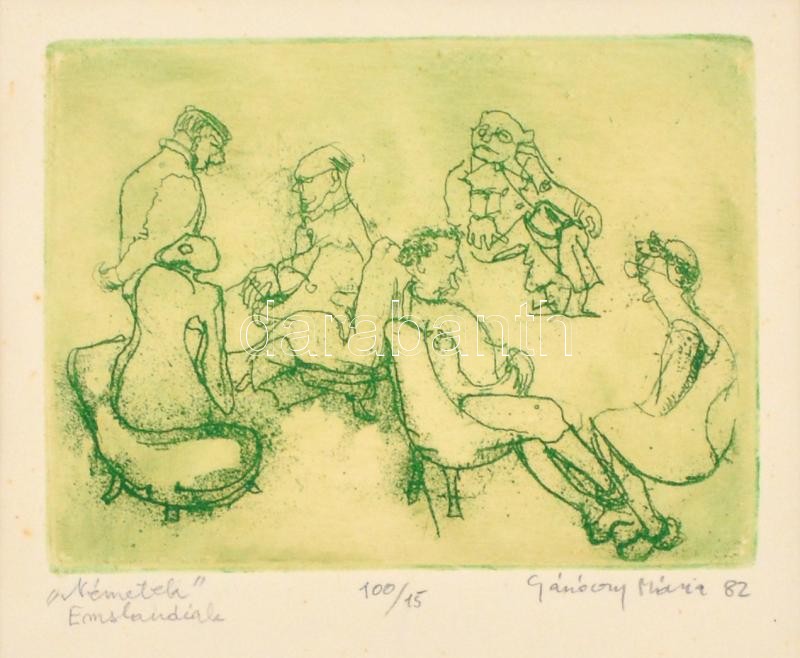 Gánóczy Mária, Breznay Józsefné (1927-), 2 db karikatúra: "Olaszok" Pármaiaik (100/22) és "Németek" Emslandiak (100/15). Színes rézkarc, papír, jelzett, számozott és datált (82), paszpartuban, egyik paszpartu teteje foltos, 8,5×11,5 cm.