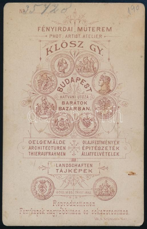 cca 1876 Budapest, Klösz György (1844-1913) fényirdai műtermében készült, keményhátú, vintage fotó, vizitkártya méretben, 10,3x6,5 cm