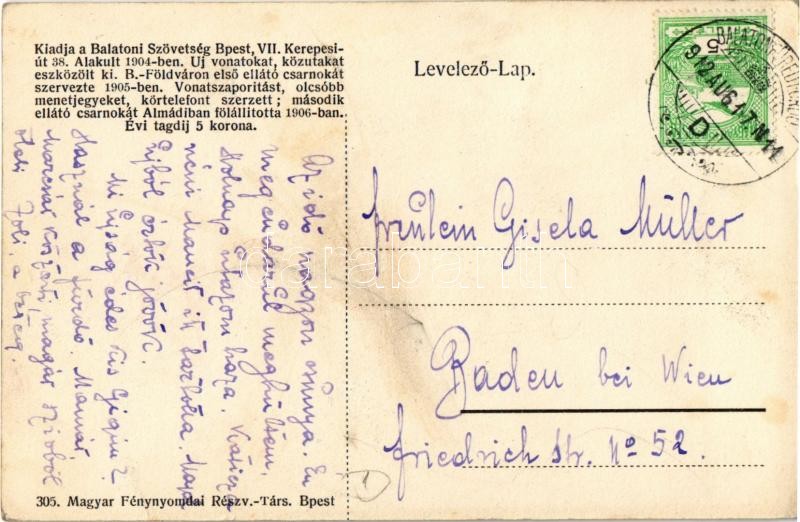 1912 Siófok, Sió részlet, sétány felfordított csónakokkal a parton. Kiadja a Balatoni Szövetség, reklám