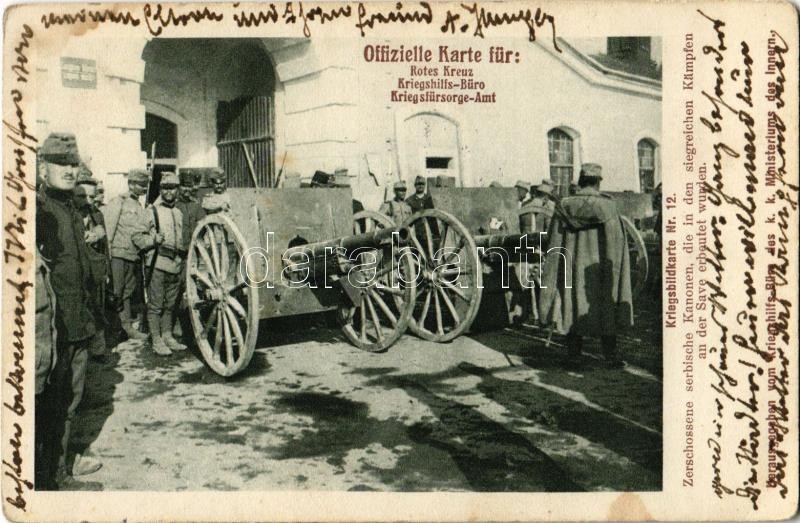 Description: 1915 Kriegsbildkarte Nr. 12. Zerschossene serbische Kanonen, die in den siegreichen Kämpfen an der Save erbeutet wurden. Kriegshilfsbüro / WWI Austro-Hungarian K.u.K. military postcard. Serbian cannons looted in the victorious battles on the Sava (fl)