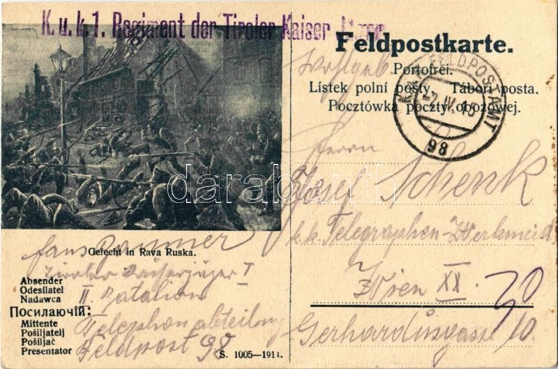 1915 Rava-Ruska, Rawa Ruska; Gefecht / WWI Austro-Hungarian military art postcard + K.u.K. 1. Regiment der Tiroler Kaiser" (EK)