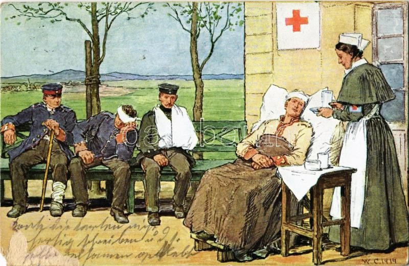 WWI German military art postcard, unjired soldiers and Red Cross nurse. Rotes Kreuz Königreich Sachsen s: W. Claudius (EM)