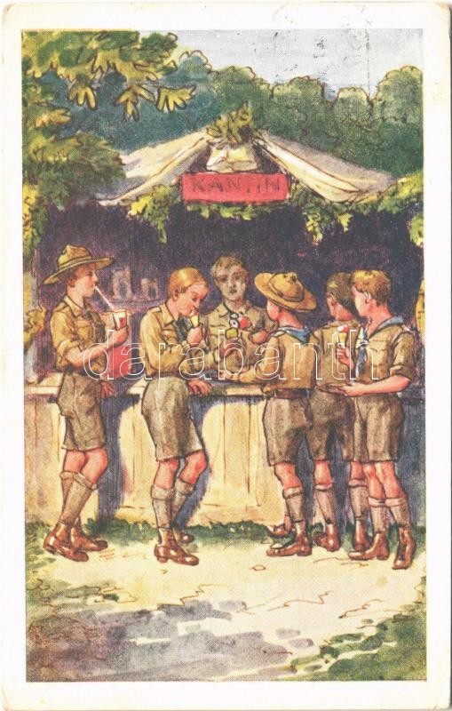 Foglalkozás után, kantin / Hungarian boy scout art postcard + "22...