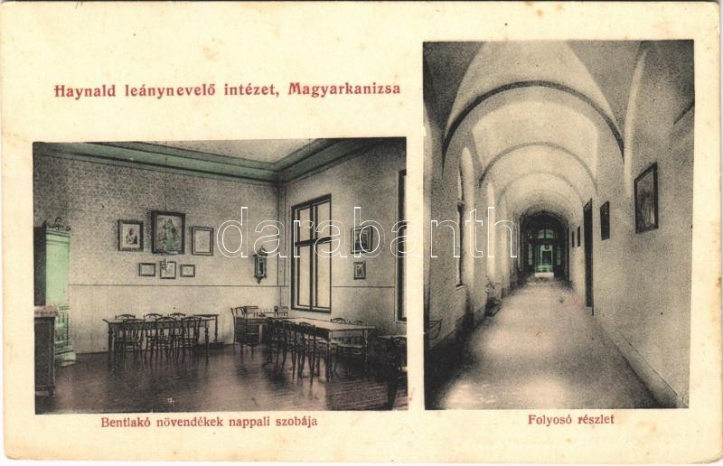Magyarkanizsa, Ókanizsa, Stara Kanjiza; Haynald leánynevelő intézet, bentlakó növendékek nappali szobája, folyosó részlet, belső / girls' boarding school, room interior, corridor (fl)
