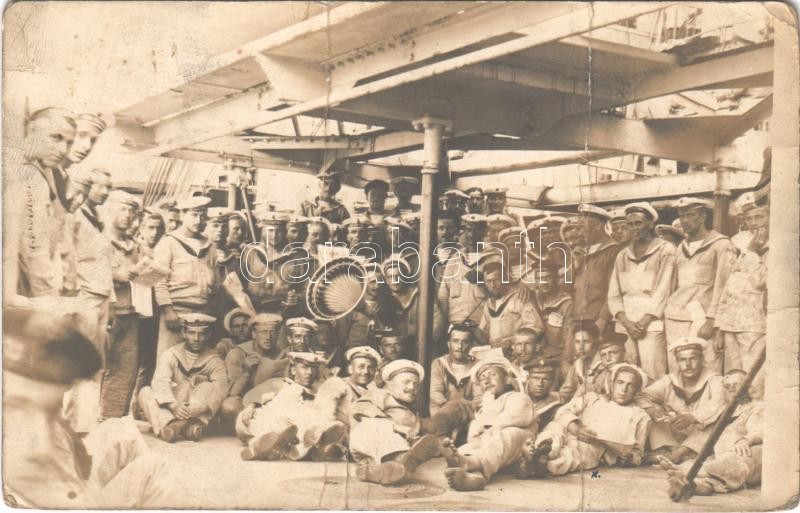 1917 SMS Tegetthoff az Osztrák-Magyar Haditengerészet Tegetthoff-osztályú csatahajója, matrózok csoportképe / K.u.K. Kriegsmarine SM Schiff "Tegetthoff", Matrosen / Austro-Hungarian Navy Tegetthoff-class battleship, mariners' group photo (fa)