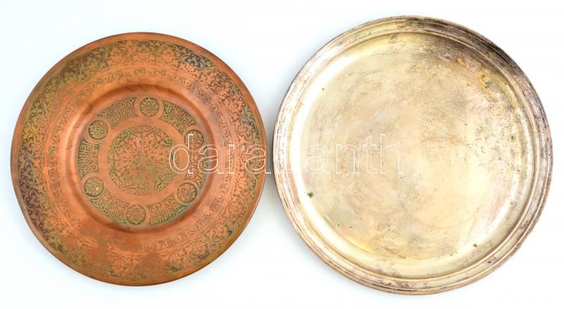 Keleties motívumú vörösréz tányér, horpadással, d: 29 cm + alpakka tálca, kopottas állapotban d: 32 cm