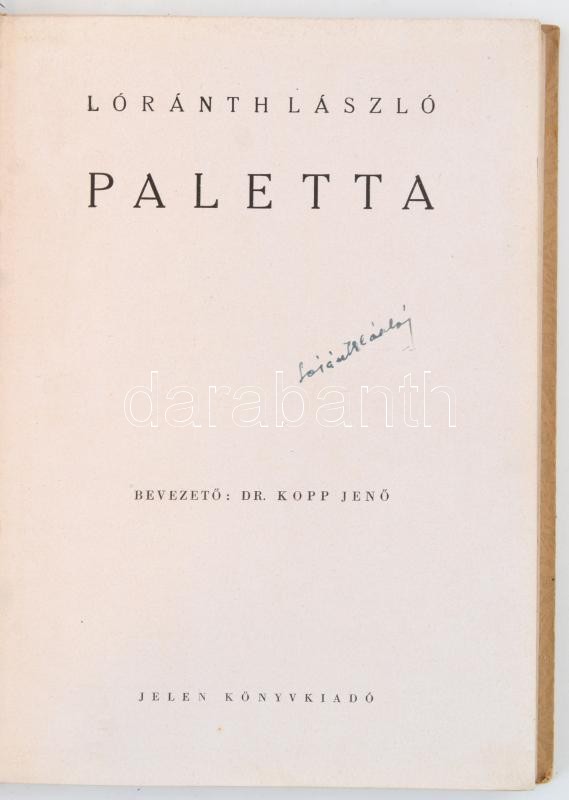 Loránth László: Paletta. Dr. Kopp JenÅ‘ bevezetÅ‘jével Bp.,[1944.], Jelen Könyvkiadó. Fekete-fehér illusztrációkkal. Kiadói sérült, javÃtott gerincű félvászon-kötésben. A szerzÅ‘, Lóránth László (1905-1966) aláÃrásával.