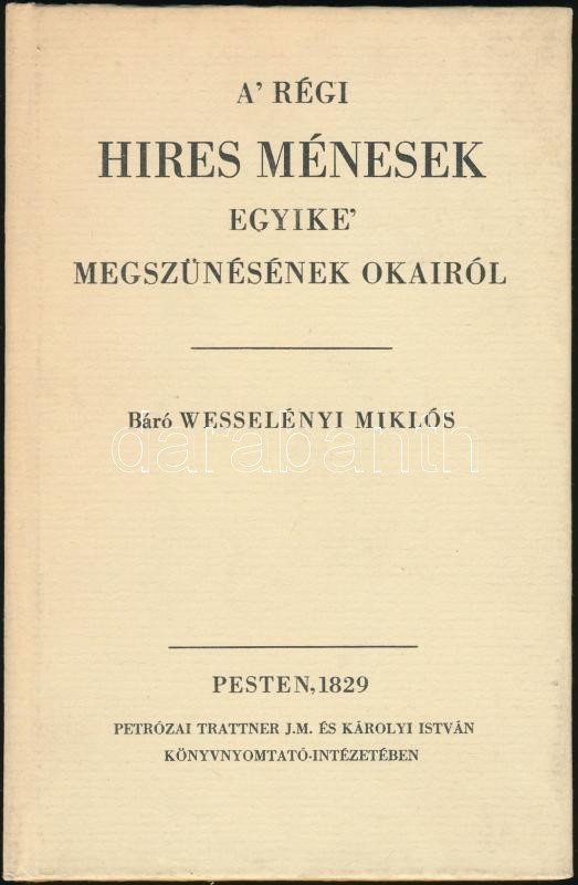Báró Wesselényi Miklós: A' régi híres ménesek egyike' megszűnésének okairól. Bp., 1985., Mezőgazdasági. Kiadói kartonált papírkötés. Az 1829-es kiadás reprint kiadása.