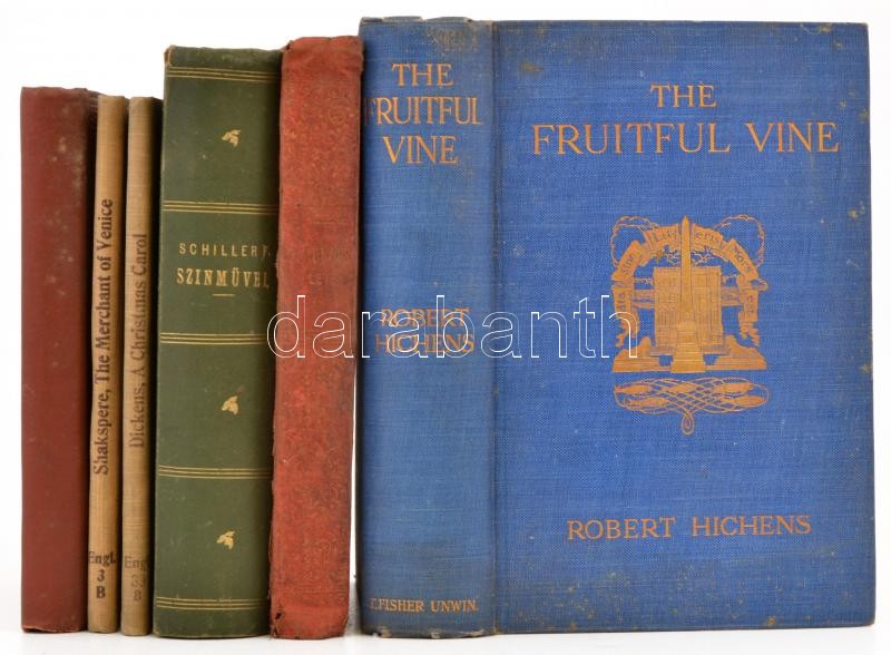 Vegyes könyvtétel, 6 db: No. IV. The Royal Readers. The Royal School Series. London, 1908, Thomas Nelson and Sons. Angol nyelven.; Robert Hichens: The Fruitful Vine. London, 1912., T. Fischer Unwin. Angol nyelven.; Charles Dickens: A Christmas Carol.Shakspere's Merchant of Venice. Bielefeld-Leipzig,1909-1912, Velhagen&Klasing. Angol és német nyelven.; Schiller: Wallenstein. Bp., 1888., "Hunyadi Ferenc."; Colon Fernand: Columbus Kristóf élete és Amerika felfedezése. Bp., 1882., Eggenberger. Különféle kötésben, változó állapotban, "Columbus Kristóf élete" kötet rossz állapotban.