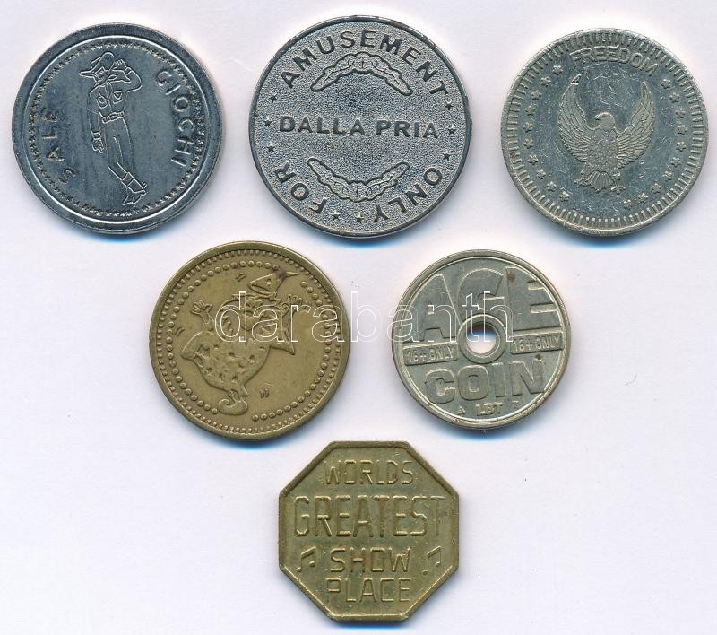 Description: 6xklf külföldi zseton tétel, közte "Las Vegas", "New York City Show Place" és "Peep Show" zsetonok T:2,2- 6xdiff token lot, within "Las Vegas", "New York City Show Place" and "Peep Show" tokens C:XF,VF