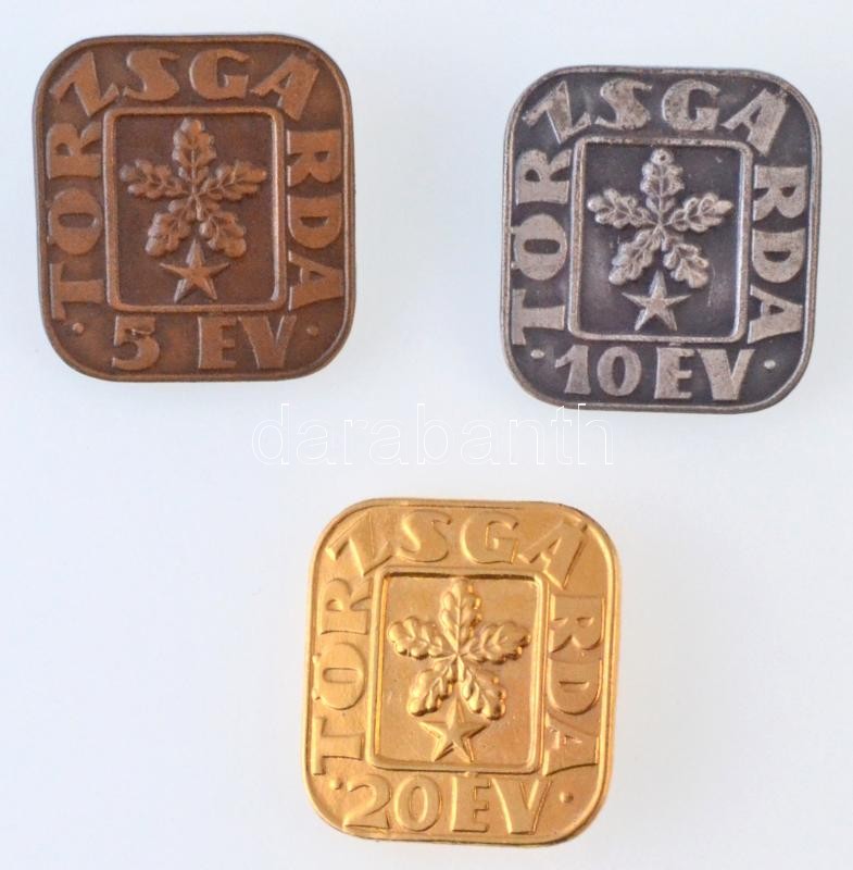 ~1970-1980. "Törzsgárda 5 év" Br jelvény + "Törzsgárda 10 év" ezüstpatinázott fém jelvény + "Törzsgárda 20 év" aranyozott fém jelvény T:1
